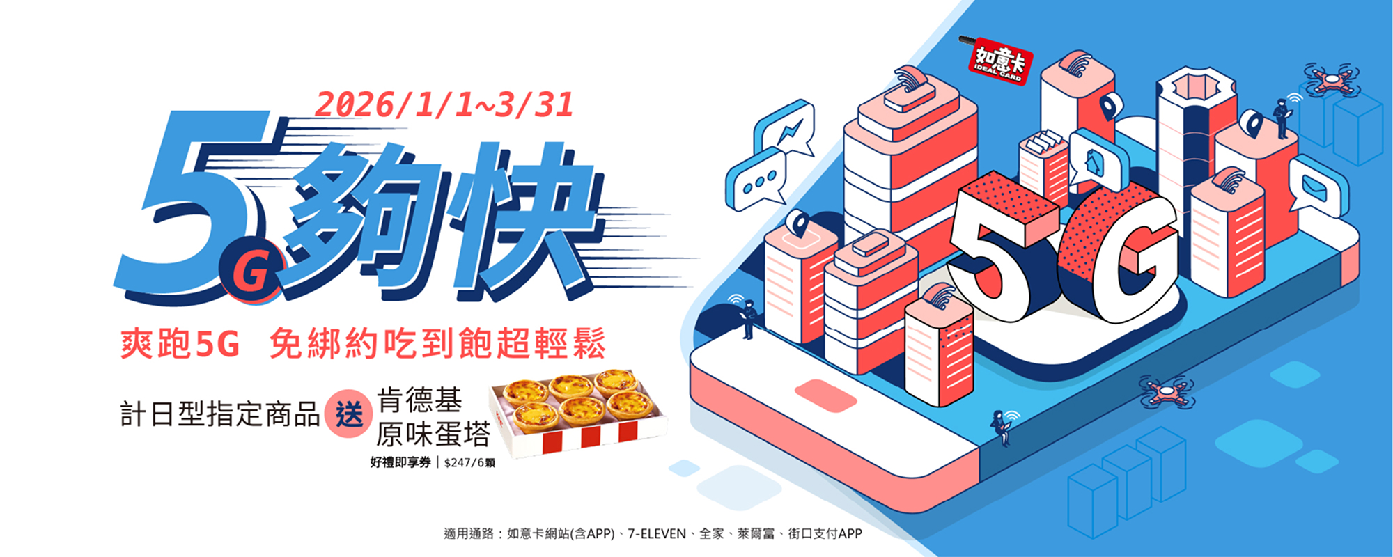 - 贈品「肯德基原味蛋塔禮盒好禮即享券」,限於如意卡網站(含如意卡APP)、7-ELEVEN超商、全家、萊爾富、街口支付APP,購買「計日型指定上網商品」並完成儲值適用,各活動期間以系統儲值完成時間為準;贈送之肯德基原味蛋塔禮盒不適用退費機制。