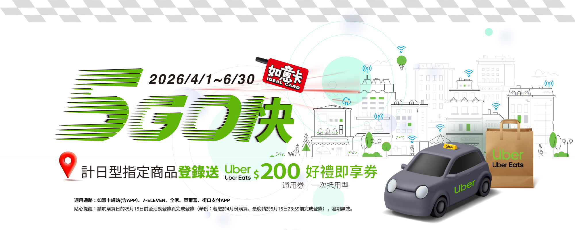 - 贈品「Uber / Uber Eats 通用券 200元好禮即享券(一次抵用型)」,限於如意卡網站(含如意卡APP)、7-ELEVEN超商、全家、萊爾富、街口支付APP,購買「計日型指定上網商品」並完成儲值適用,各活動期間以系統儲值完成時間為準;贈送之Uber / Uber Eats 通用券 200元好禮即享券不適用退費機制。