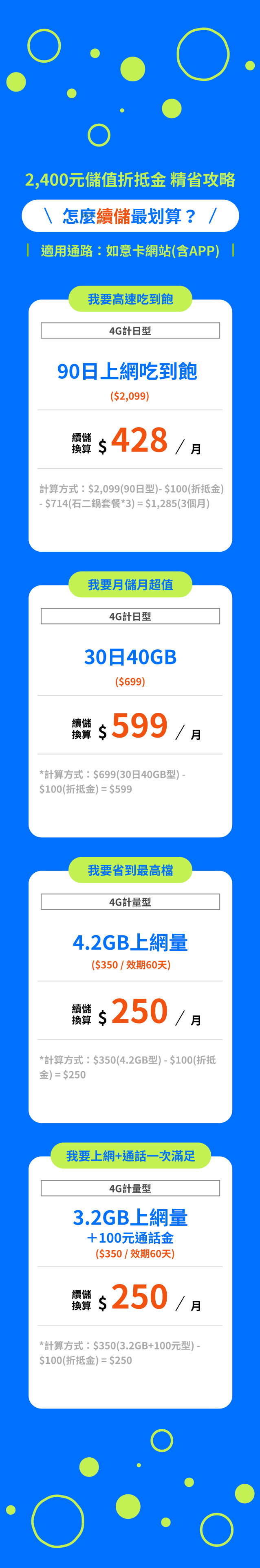 *註4:「2,400元儲值折抵金」限如意卡網站e儲值300元以上之上網商品(不含金額型商品)使用,單張面額100元,單筆限用一組。2,400元儲值折抵金為24張,將於每月5號前發送1張至如意卡會員帳戶中,為期24個月。每張使用效期60天。