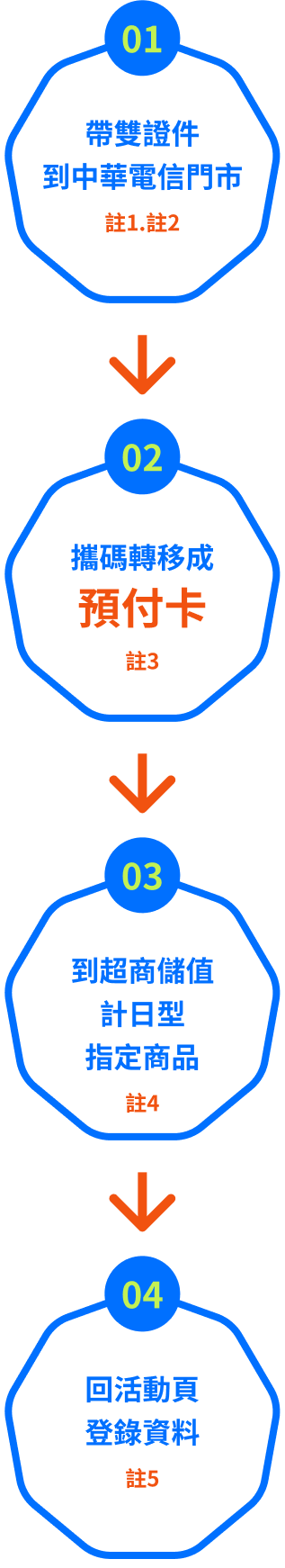 ● STEP 1 無框電信用戶於活動時間內完成攜碼轉移中華電信預付卡,並於限定通路(7-ELEVEN、全家)完成e儲值指定上網方案,指定方案為:4G一般計日型30日(40GB)、30日、90日或4G學生計日型30日、90日。