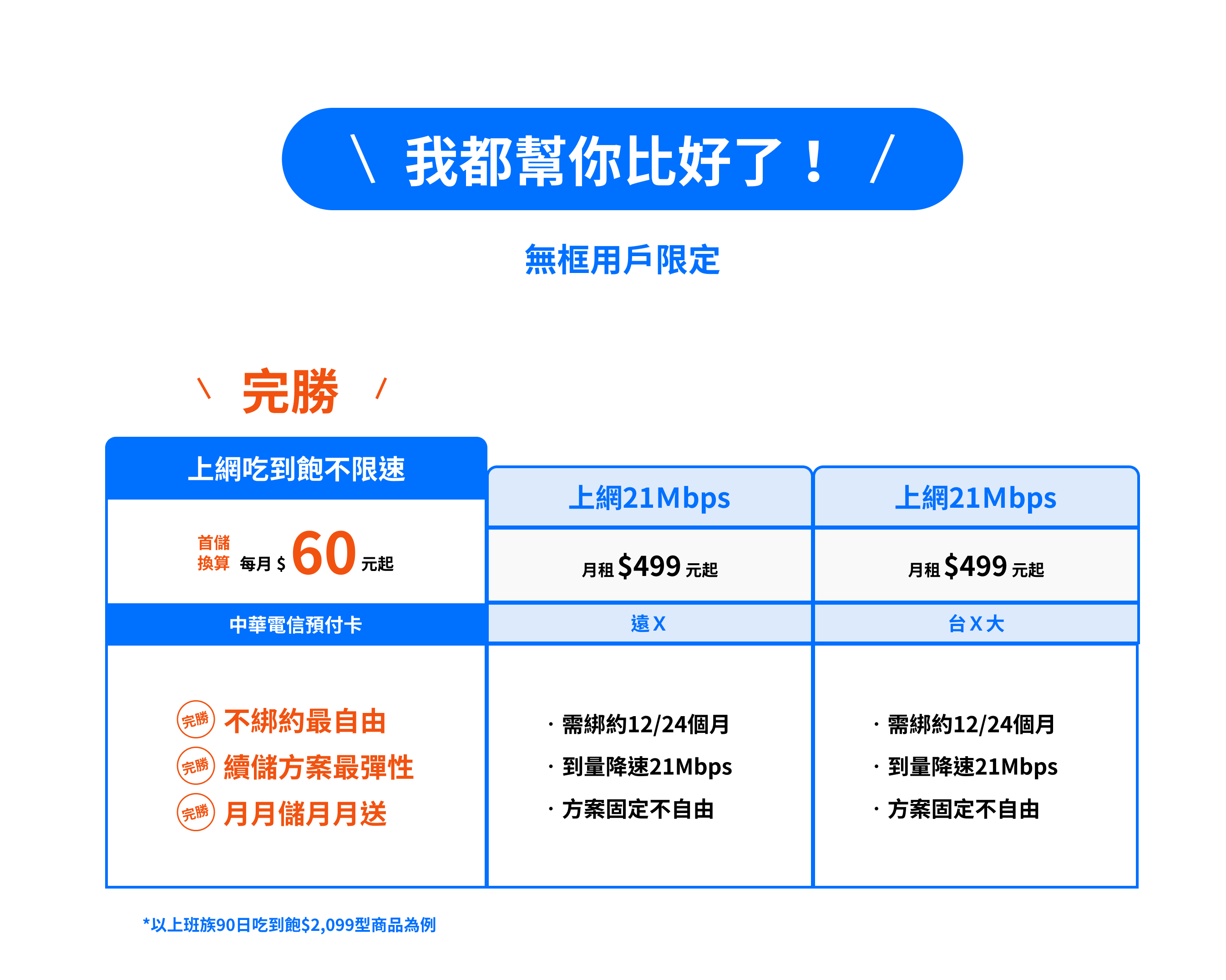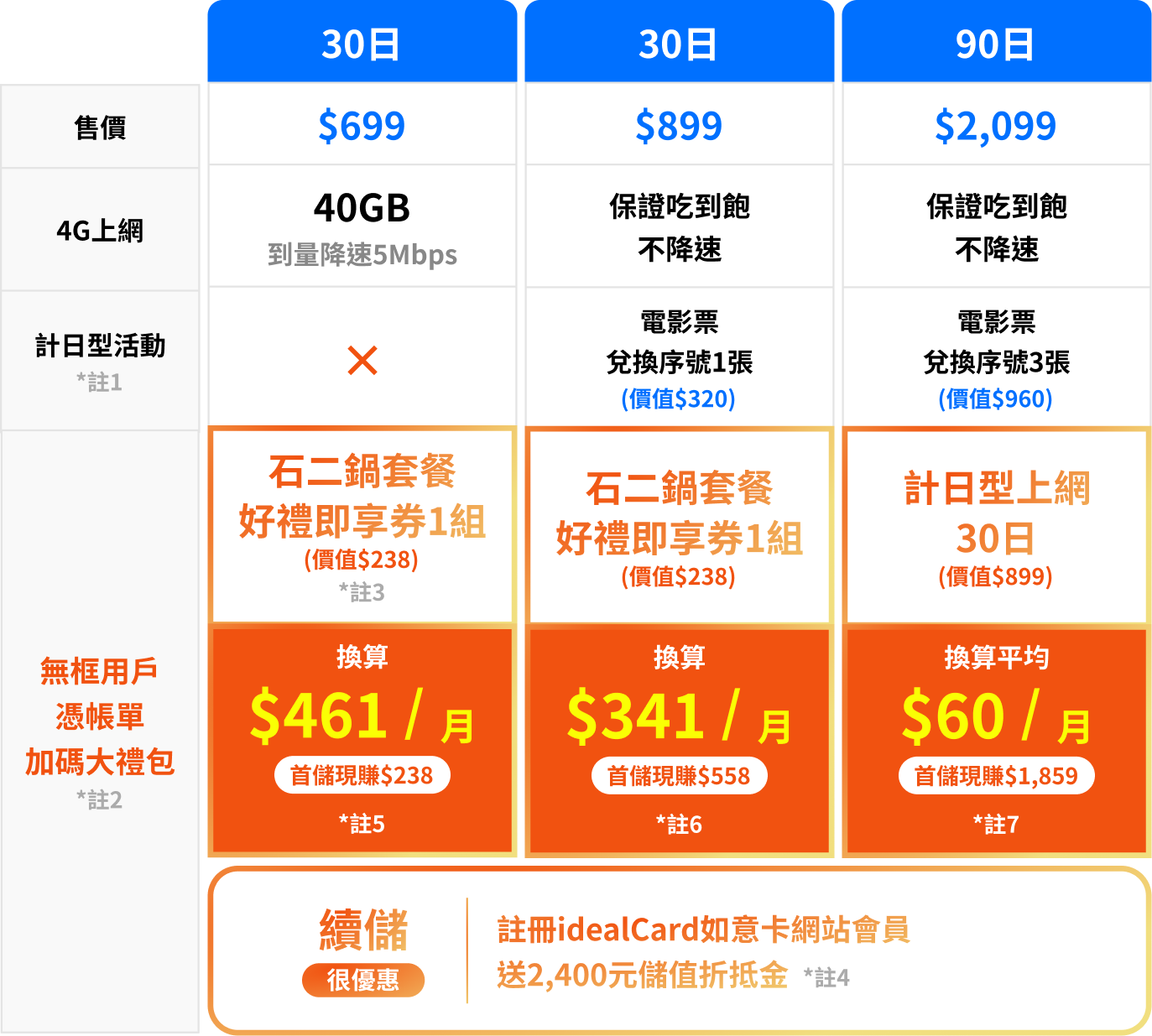 *註7:90日吃到飽 $2,099型商品首儲優惠平均計算方式:$2,099 - $960(電影票兌換序號3張) - $899(計日型30日吃到飽)] / 4個月 = $60。