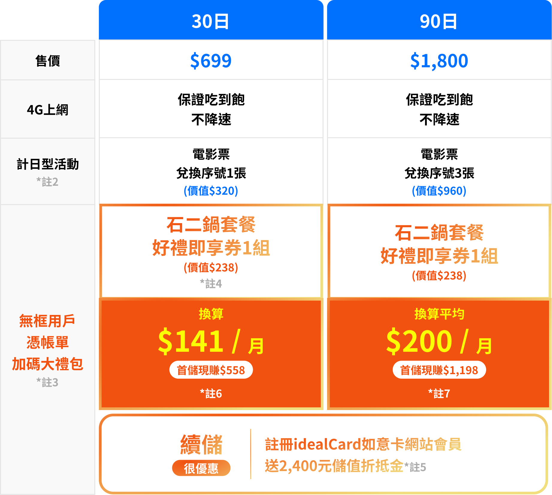 *註6:學生30日吃到飽 $699型商品首儲優惠平均計算方式:$699 - $320(電影票兌換序號) - $238(石二鍋即享券) = $141。